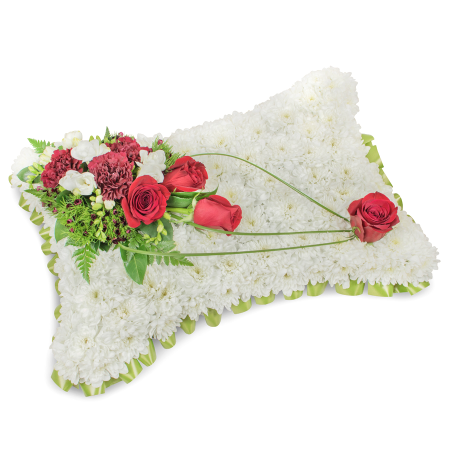 Express your condolences with our graceful bouquet, featuring an elegant mix of white chrysanthemums, bright red roses, white freesias, dark red carnations, dianthus, and bear grass.