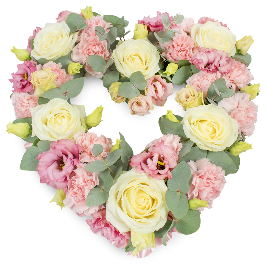 Celebrate love and remembrance with our Radiant Open Heart Flower Arrangement. This beautiful bouquet features a vibrant mix of white roses, pink carnations, pink lisianthus, and eucalyptus leaves, masterfully arranged to create a stunning visual tribute.